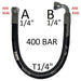 Flexibler Hydraulikschlauch mit maßgefertigten Edelstahl-Anschlüssen für Hochdruckanwendungen. Der Hydraulikschlauch hat einen Durchmesser von 1/4 Zoll und ist mit vorgepressten Anschlüssen ausgestattet. Anschlüsse und Klemmringe sind aus Edelstahl gefertigt, der Schlauch besteht aus NBR-Kautschuk mit zwei Stahlgeflechten. Maximaler Betriebsdruck: 400 bar. Die Details der Anschlüsse entnehmen Sie bitte den Fotos. Die gewünschte Länge wählen Sie bitte im Dropdown-Menü.