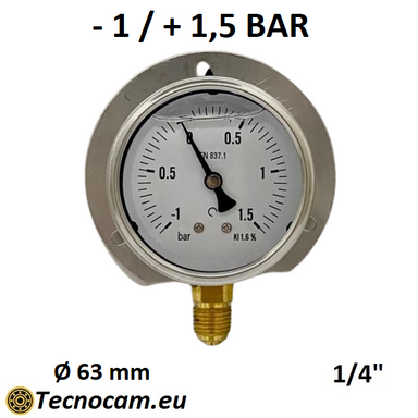 Manomètre à vide gradué de -1 à +1,5 bar, avec raccord arrière, bride et glycérine. Ce manomètre est utilisé dans les secteurs industriel, civil...
