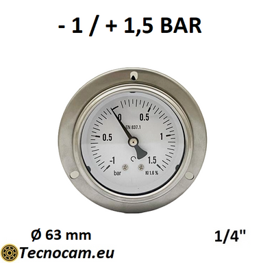 Manomètre à vide sec, gradué de -1 à +1,5 bar, avec raccord arrière et bride. Ce manomètre est utilisé dans les secteurs industriel, civil et ag...