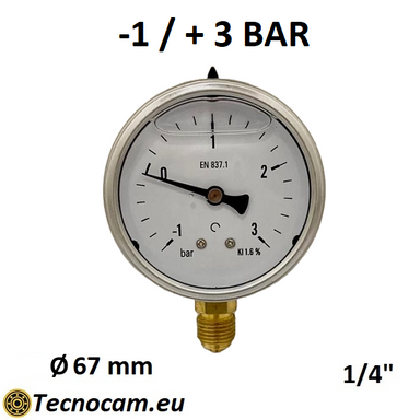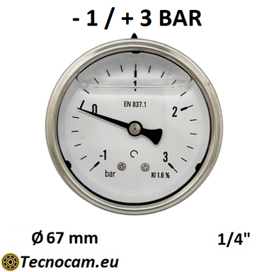 Manomètre à vide gradué de -1 à +3 bar, rempli de glycérine. Ce manomètre est utilisé dans les secteurs industriel, civil et agricole pour des a...